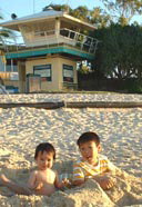 | 【第4日目】 快晴。朝、ゴールドコーストのビーチへ(右写真)。 南半球の4月は秋だが、この辺りまだ、泳いでる人も沢山いた。日差しが強く、特にオーストラリアは紫外線が強いことで知られている。小さい子がいるので、昼前には引き揚げるつもりで行った。 ビーチでアサリを取っている日本人のおじさんにあった。釣りのためのエサ探しだという。東京とオーストラリアを行ったり来たりの生活らしい。数年前からこういう人は増えているようだ。 |