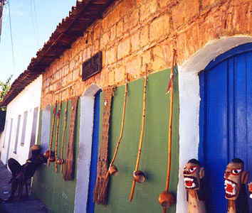 | ポルト・セグーロのみやげ物屋。 壁に掛けられているビリンバウ Berimbau はインディオ起源の民族楽器。 カポエイラ Capoeira という音楽性のある、踊るような格闘技にもよく使われる。 苦労して日本まで持ち帰ったが、数年後 子どもに壊された。(ToT) |