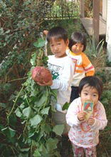 11月 芋掘り(さつまいもの収穫) 雑草除けぐらいにしか考えていなかった さつまいもだが、こんなに大きいのが 獲れました。桜島ダイコンのような形 でしたが…。切って大学イモにしたら、 美味しいのなんのって…。 近所の子どもも来て。芋掘り風景⇒ |