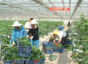 ←収穫風景 近代的な灌漑設備もあり、きゅうり、トマト、葉物野菜などをつくっていた(左写真)。 僕は家庭園芸なんかもやってるくらいで、農業には少し興味があるので面白かった(でも気持ち的にはやはり、こういう機械的なところより、土を耕してつくるほうに憧れるが…)。 |