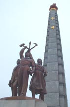←主体(チュチェ)思想の塔 午後、平壌観光には欠かせない、社会主義朝鮮のモニュメント、主体思想塔へ。 主体(チュチェ)思想は、千里馬(チョンリマ)運動などと並び、故 金日成主席が提唱した朝鮮型社会主義建設のための思想。 塔は市内の中心部にあり、展望台になっていて平壌市内を一望に見渡せる。 |