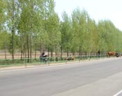 空港を出ると、車が3台待っていた。6人が分乗し、平壌市内へ向かう。 市街地まで20分ほどだったが、それまで 牧歌的な風景が続いた(左写真)。 道沿いには、畑もあり、牛を引いている人もいた。丘の上の梨の木畑が白い花を咲かせ、柿の木も植わっている。山羊を数頭 放牧している人もいた。 |