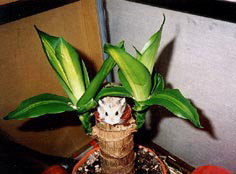 植木鉢ケージ “観葉植物バージョン” (ユッカの木3本) 観葉植物を植えた、大きい植木鉢 (直径48センチ)の中で飼ってます。 尚、観葉植物の中にはアボカドのように ハムスターにとって有毒なものもあります のでご注意ください。 内部の壁の高さは、20CM もあれば 充分です(25CM を推奨)。 植木鉢の中に、巣箱、餌入れ、回し車、 給水ボトル、砂風呂、かじり木などを 入れてやります。 |